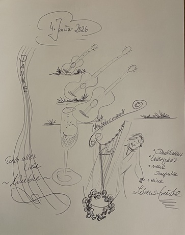 Wunderbar gleichsam nimmt dieser Friedensgruß menschliche Gestalt an: Auch in diesem Jahr sind wir mit einer fröhlichen Musik im Kreise lieber Freunde und Freundinnen losgegangen, nehmen Begegnungen und Töne mit in das, was vor uns liegt.